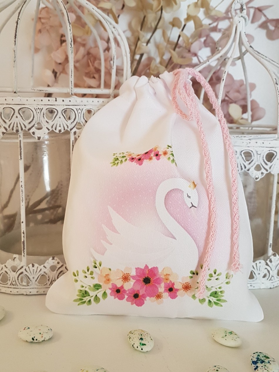 Μπομπονιέρα βάπτισης πουγκί κύκνος δέσιμο με κορδέλες και κουφέτα χατζηγιαννάκη.