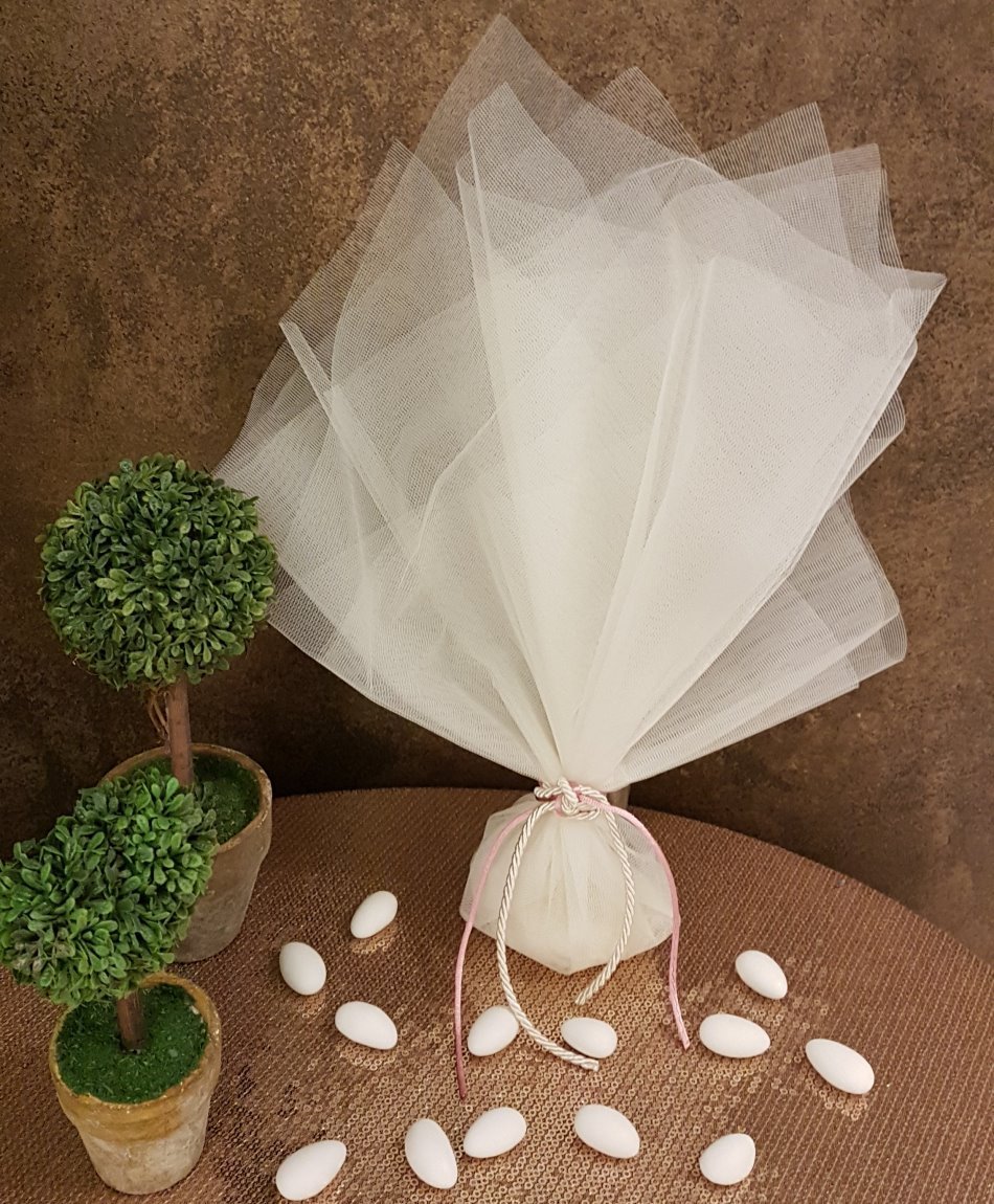 Μπομπονιέρα γάμου με 2 φύλλα γαλλικό τούλι 50x50 ιβουάρ και δέσιμο με κόμπο από κορδόνι γυαλιστερό ιβουάρ και σάπιο μήλο.