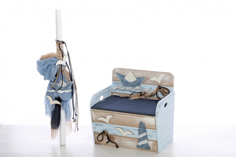 Σετ βάπτισης της εταιρίας Bellissimo ξύλινο κουτί καναπέ με θαλασσινό θέμα στα χρώματα μπλέ και μπέζ.