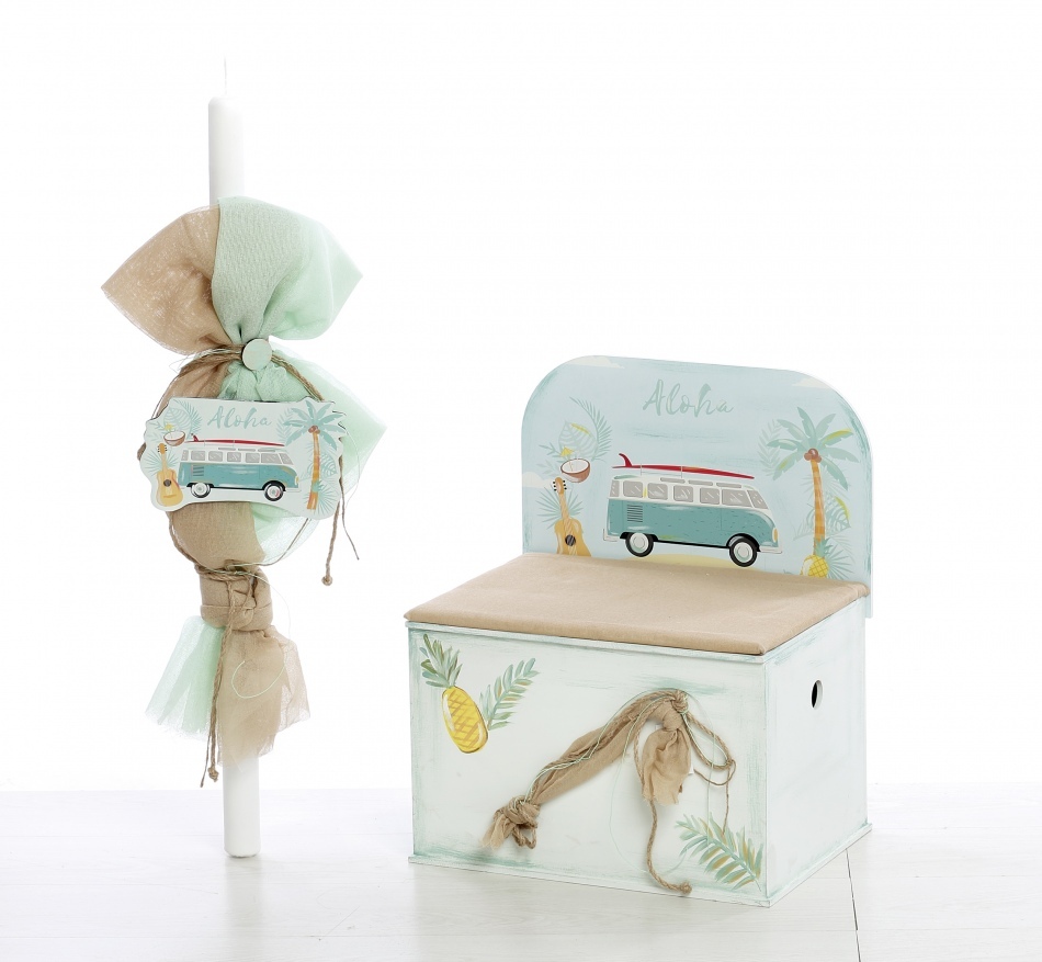 Σετ βάπτισης ξύλινο κουτί καναπές με θέμα aloha στα χρώματα της μέντας και του μπέζ.